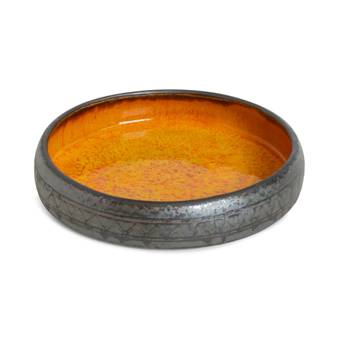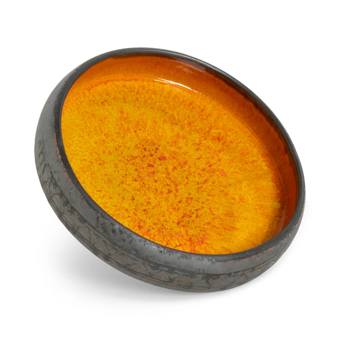 Our Amber Round Shallow Bowl bridges the gap between plate and bowl, perfect for pasta, salads, or artistic food presentation. The stunning Amber interior provides a beautiful canvas for your culinary creations, while the dark Onyx exterior adds sophisticated contrast.