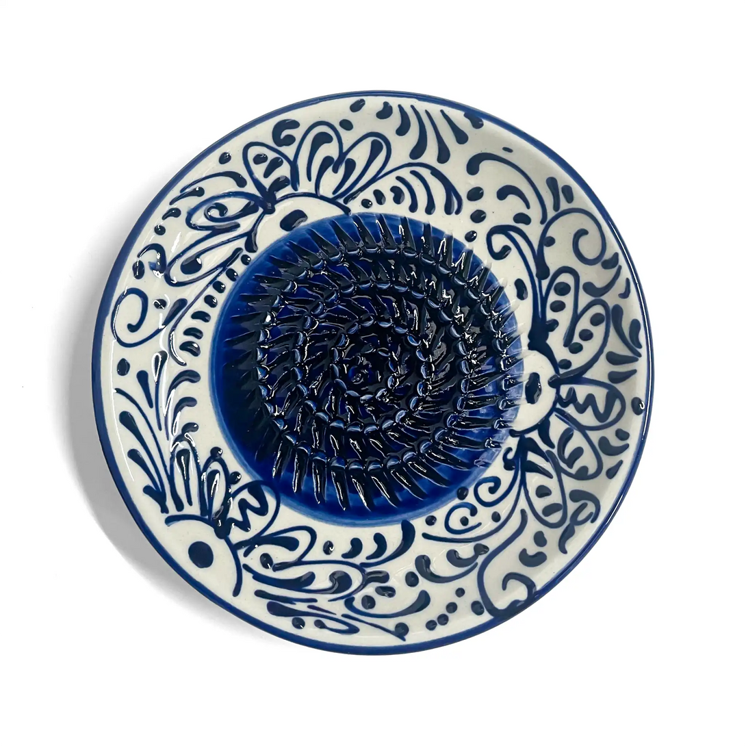 Eye-catching and brightly coloured ceramic tableware, handmade and painted in Spain. this unique garlic grater plate is designed to effortlessly grate garlic, ginger, and other small ingredients with ease and add a pop of colour to your kitchen! The hand-made and hand-painted design ensures that each piece is one-of-a-kind, making it a great addition to your kitchenware collection.