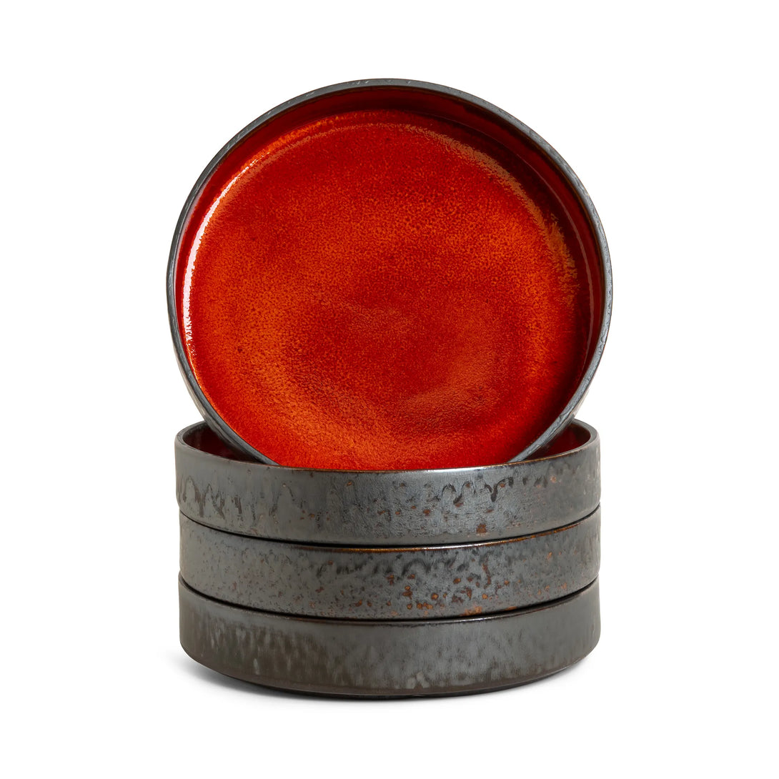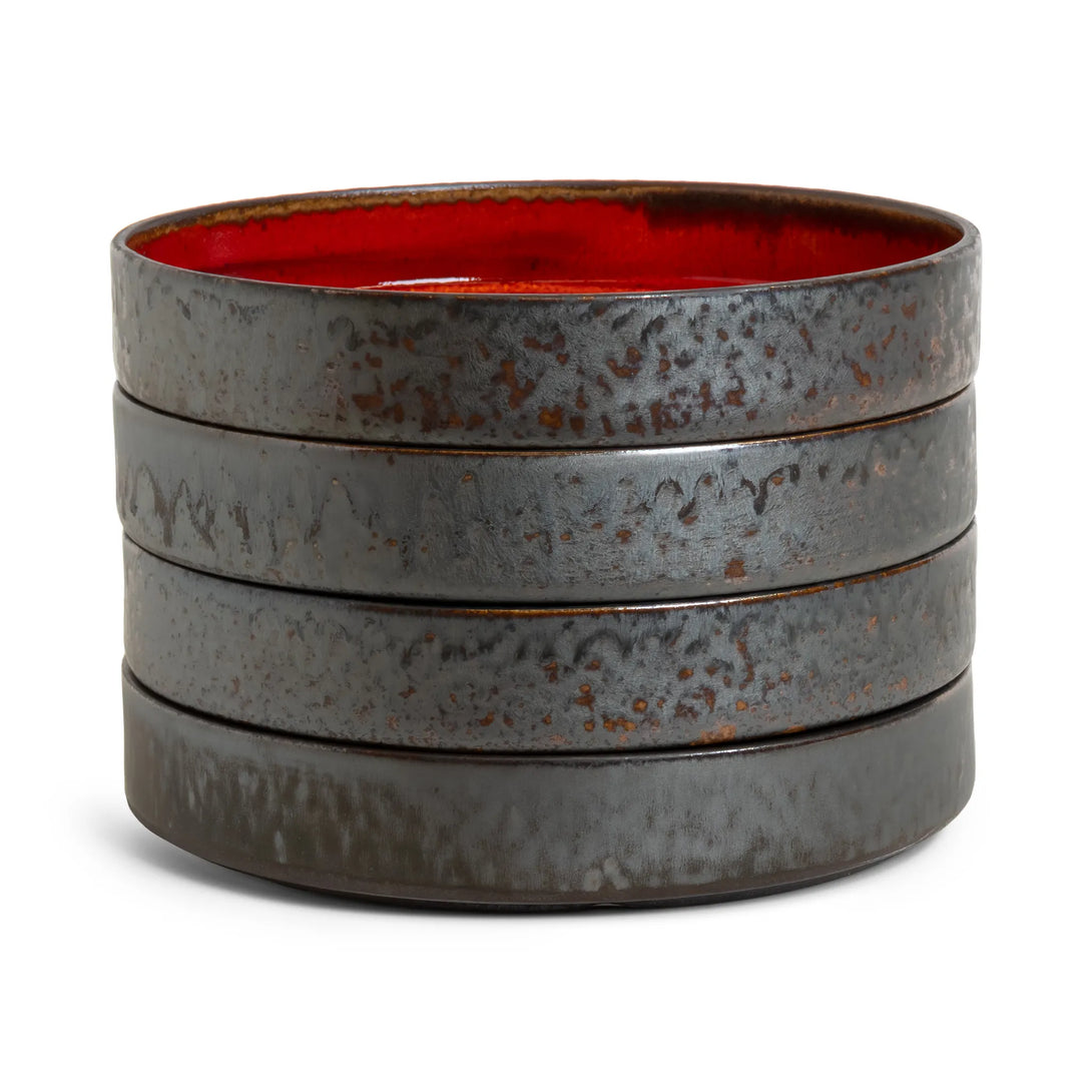 Our Set of 4 Ruby Edge Shallow Bowl combines modern geometric design with exceptional functionality. Featuring clean, straight walls and a stunning ruby-red interior, this handcrafted stoneware piece creates a beautiful canvas for your culinary presentations while the dark Onyx exterior adds sophisticated contrast.