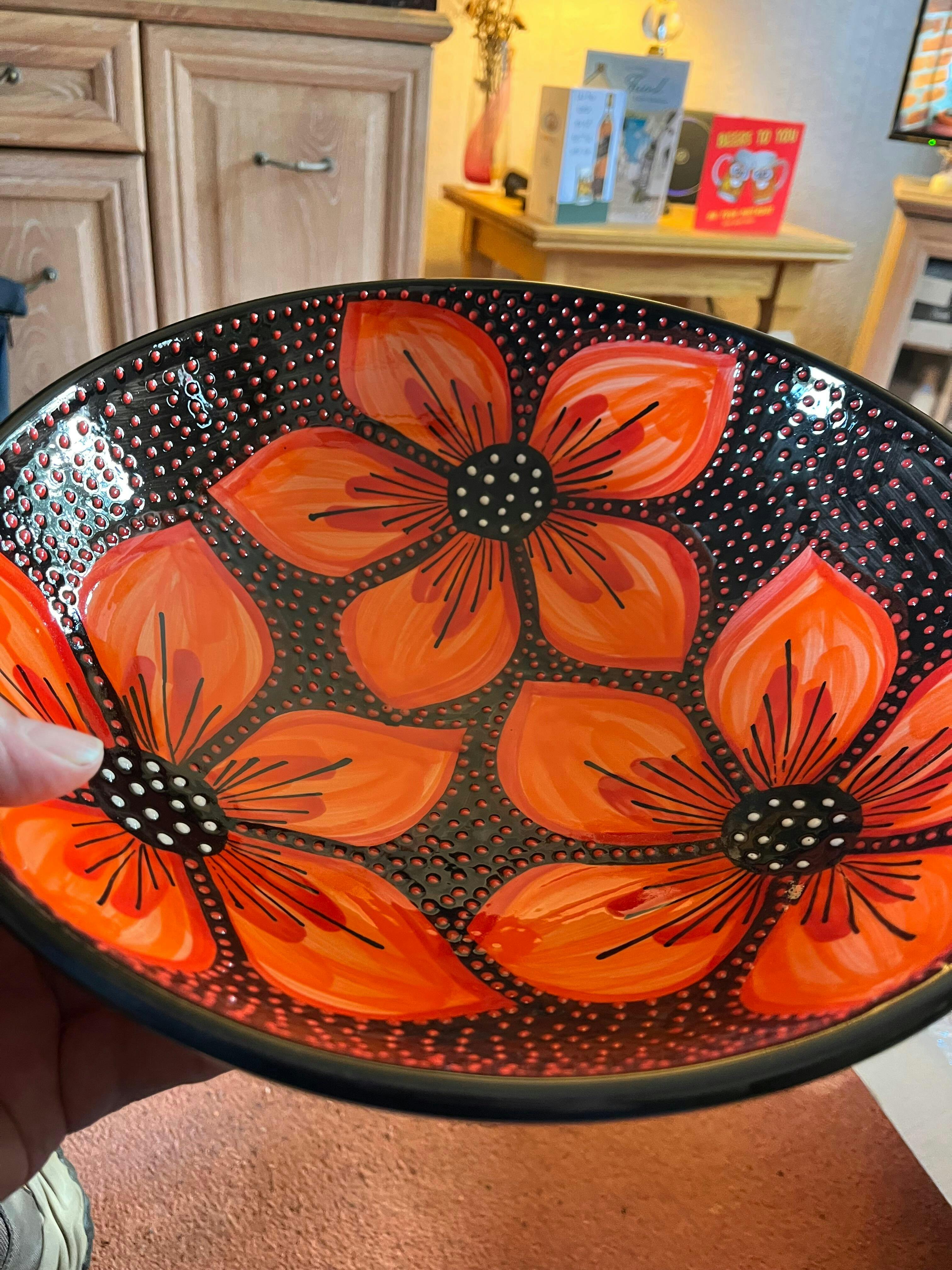 Eye-catching and brightly coloured ceramic tableware, handmade and painted in Spain. This unique and artistic Serving Bowl is perfect for adding a pop of colour to your dining table. The hand-made and hand-painted design ensures that each piece is one-of-a-kind, making it a great addition to your kitchenware collection.
